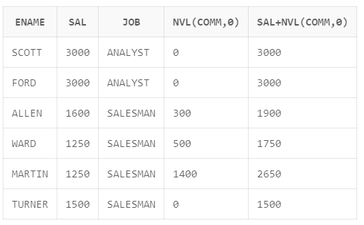 SELECT ENAME, SAL, JOB, NVL(COMM,0), SAL+NVL(COMM,0)